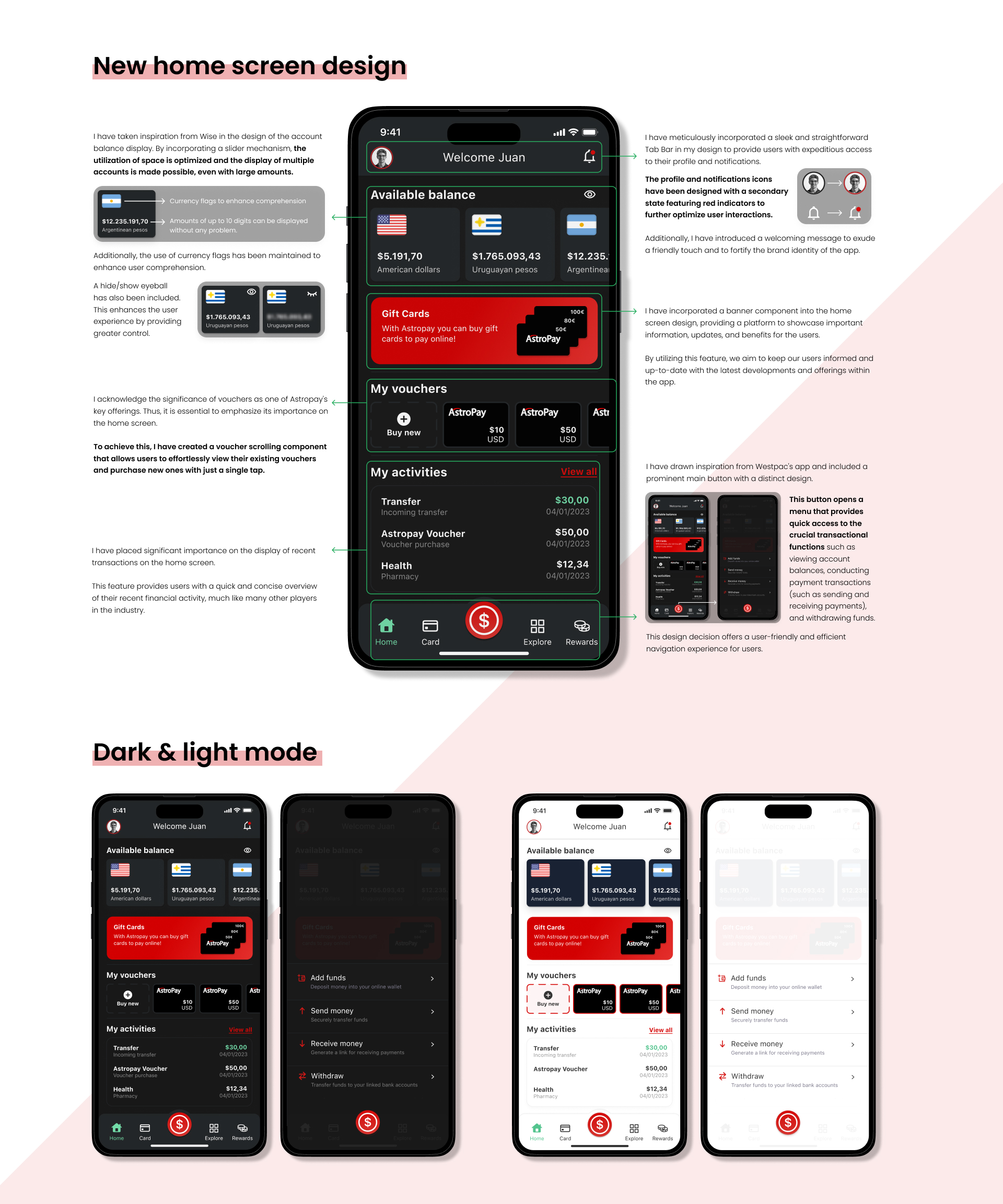 Hands-on work included analyzing competitor apps, conducting heuristic evaluations, interpreting existing metrics, developing UI concepts, testing, defining problems and scope, interaction design, and final handoff. The goal was to create a more intuitive and engaging user experience, incorporating both dark and light modes to align with AstroPay's visual identity.